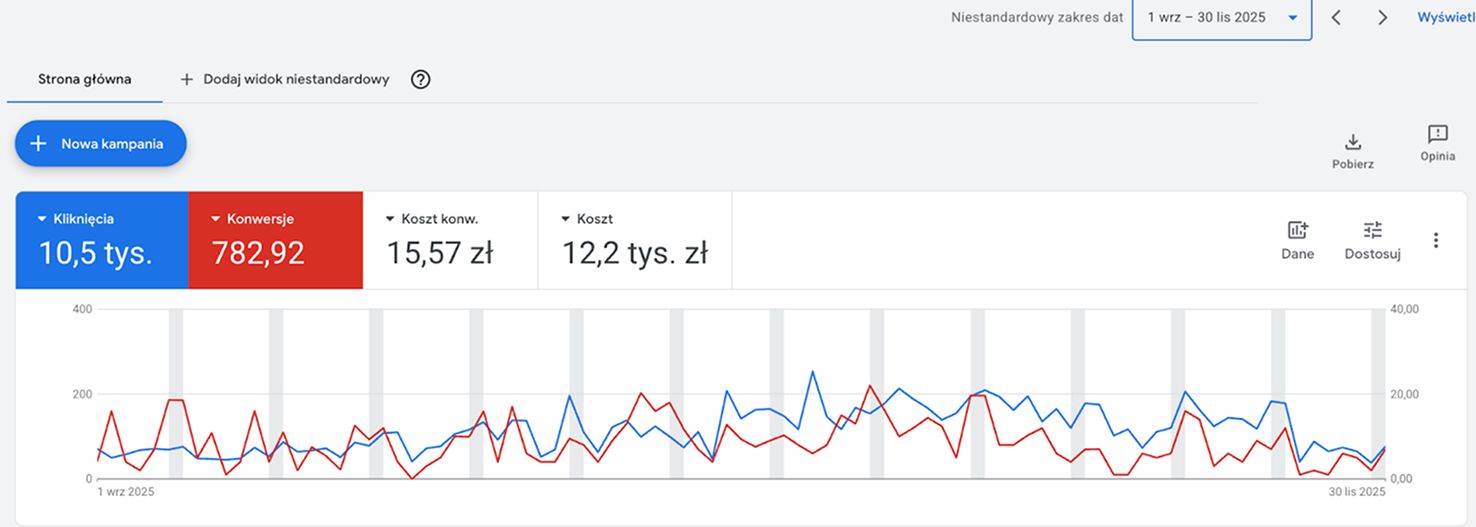 Po roku działań kampania generuje wielokrotnie więcej konwersji przy znacznie niższym koszcie. Optymalizacja analityki, fraz i stawek pozwoliła jednocześnie zwiększyć skalę i poprawić efektywność działań.
